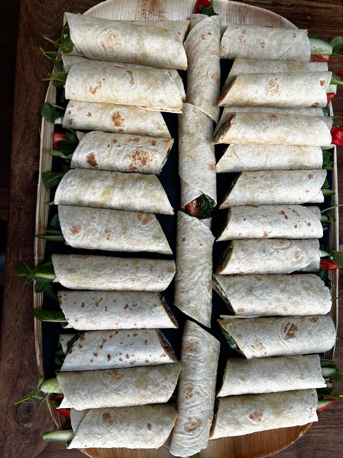 Homemade wrap with cream cheese, cucumber, red pepper, dill, mint and walnut pieces